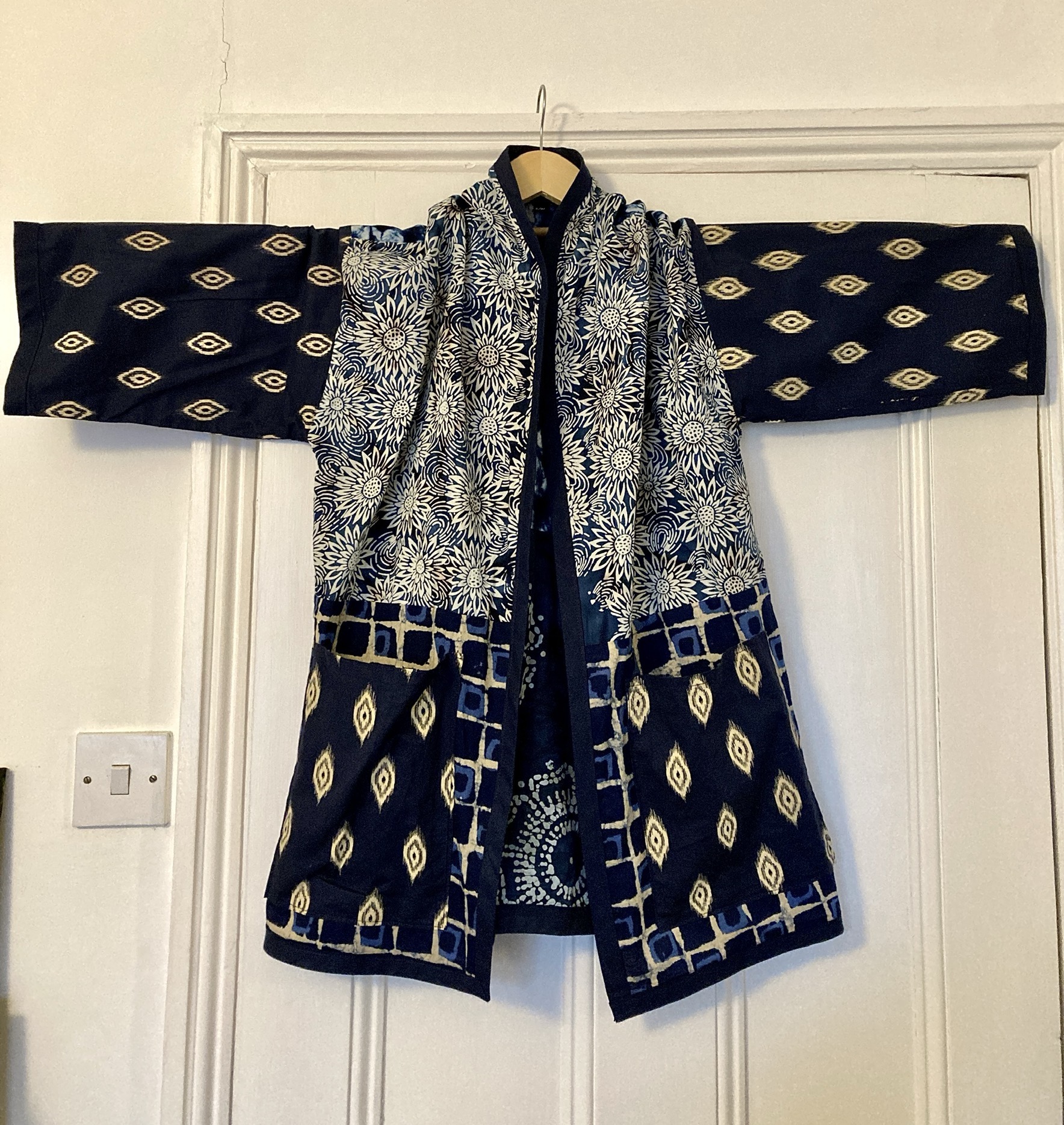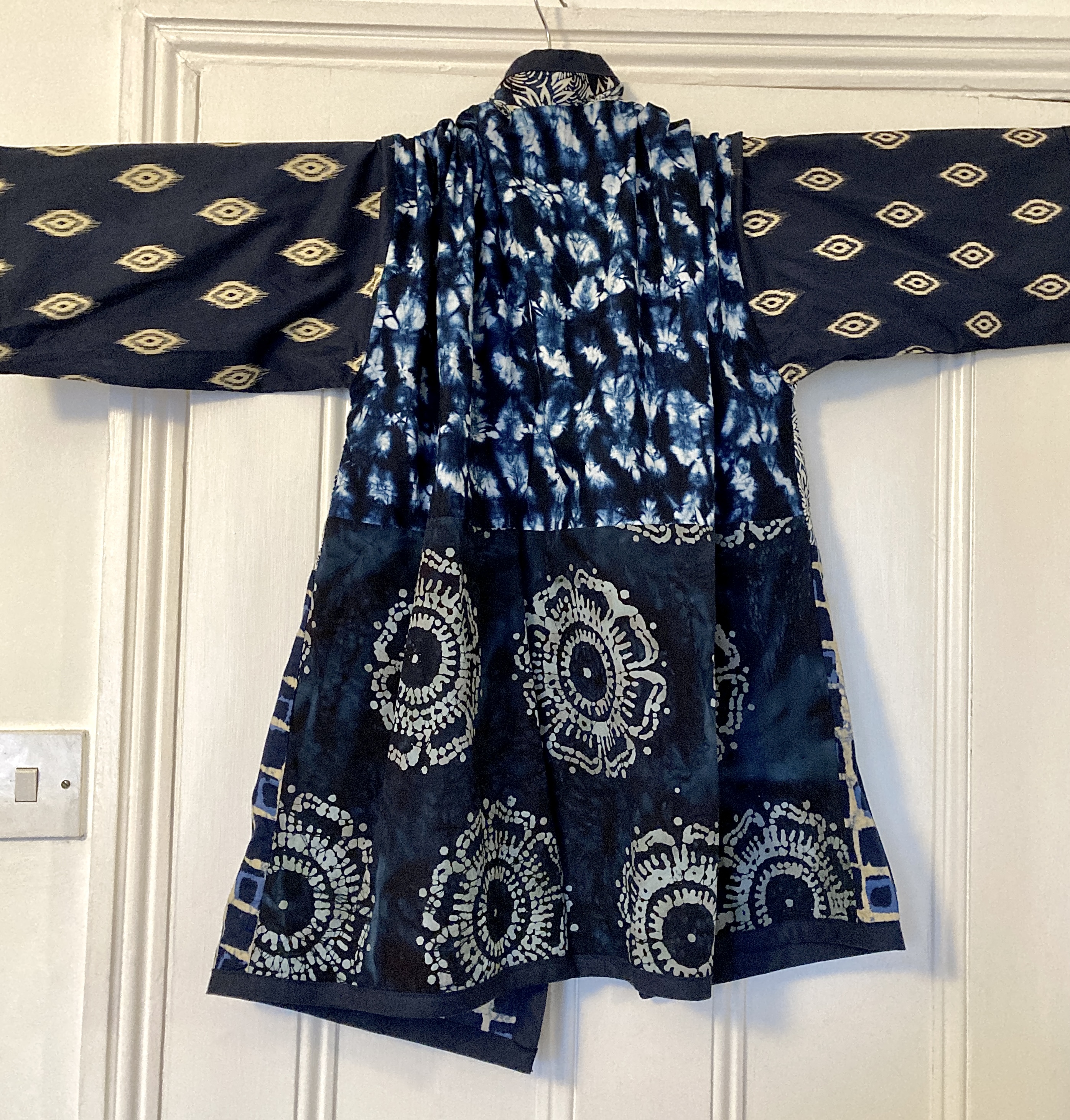 Short Jacket Kimono “INDI” is created from a mix of beautiful Blue prints ,Tie Dye  and Wax Resist techniques.