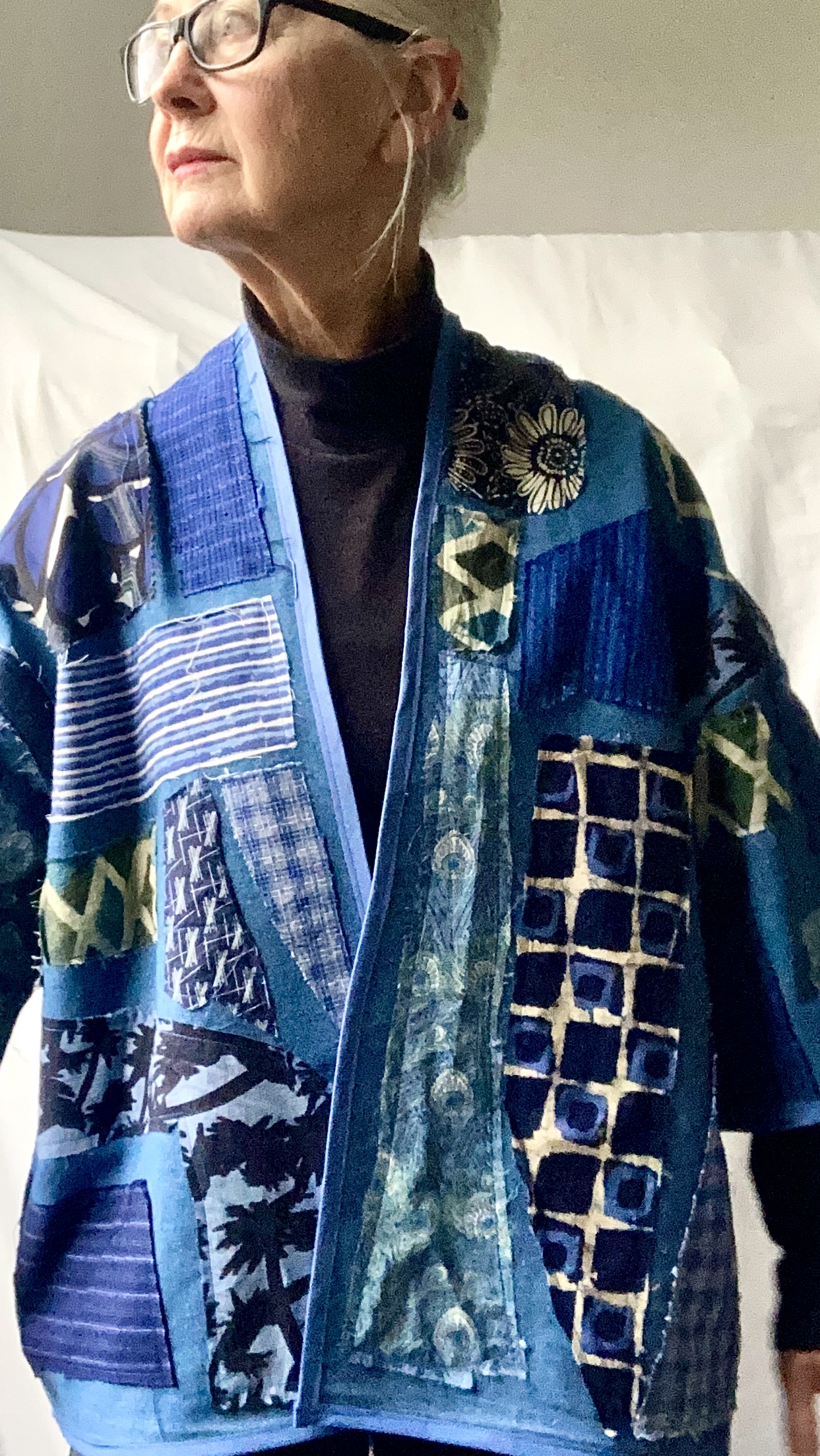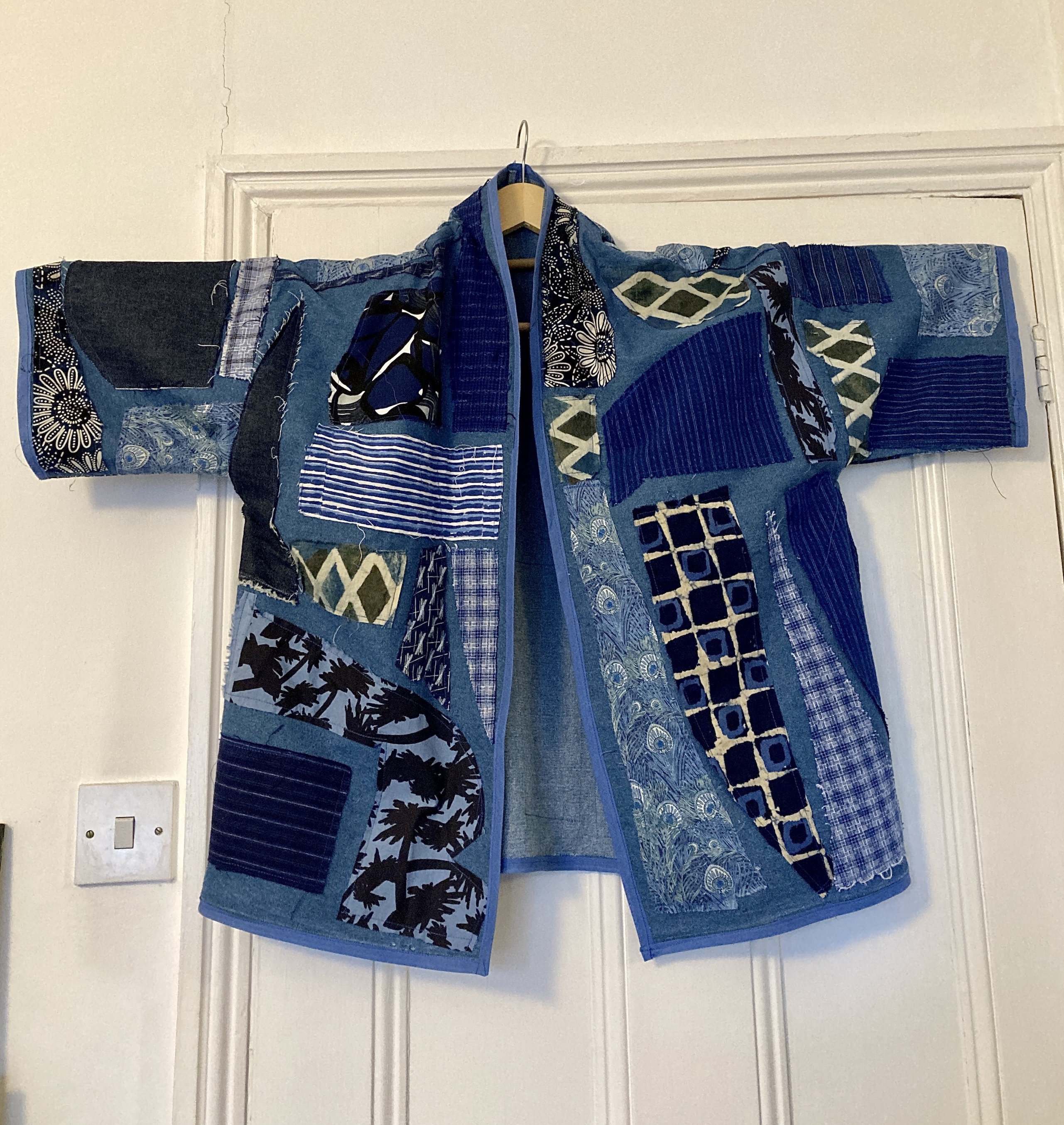 A completely covered collaged jacket trimmed with a Blue Bias binding.