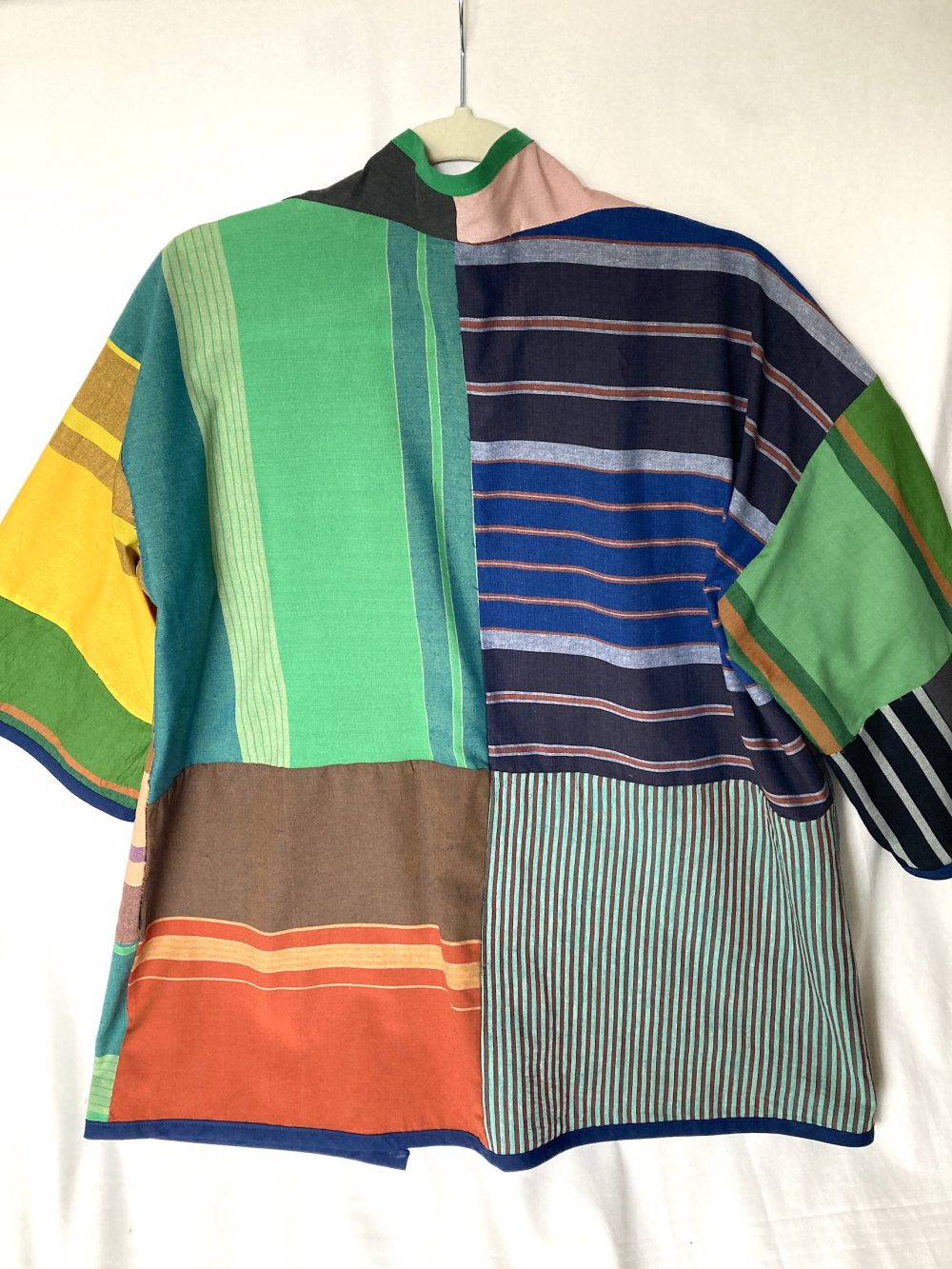 Kimono “MENTA” is created using many smaller pieces of remainders of other Kimonos. A patchwork of Indian and Sri Lankan colour woven Stripes in Bold colours Trimmed with Indigo Bias Binding.The result is asymmetrical and completely unrepeatable coat of many colours.