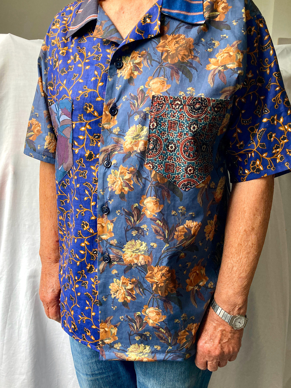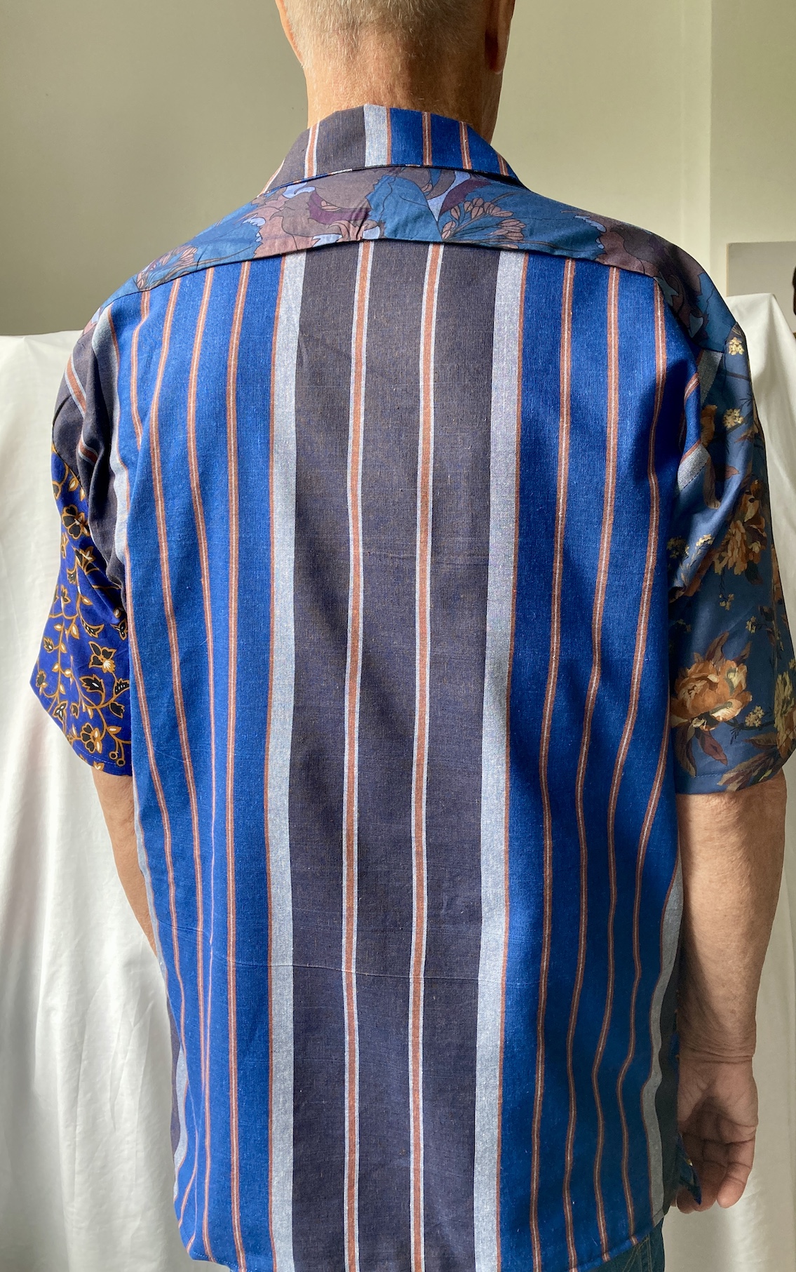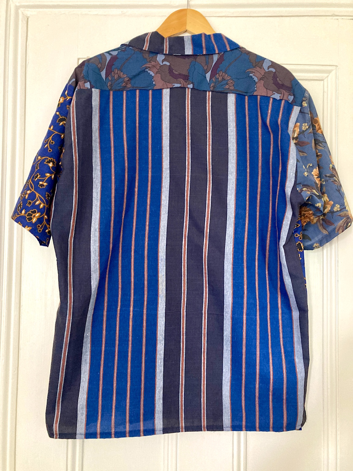 A casual cotton Man’s Shirt featuring a ,mix of Blue and Brown cotton prints and woven stripes.